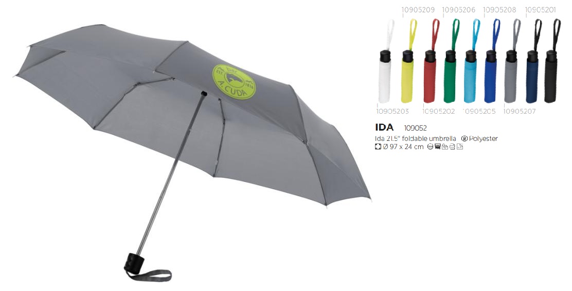 De Ida 21,5" opvouwbare paraplu is klein en compact maar biedt een uitstekende bescherming tegen de regen. Door het handmatige schuifsysteem is de paraplu gemakkelijk te openen en te sluiten. Verder heeft de paraplu een sterk metalen frame, metalen baleinen en een kunststof handvat voor een goede grip. Dankzij zijn formaat past hij opgevouwen perfect in een (hand)tas. De Ida paraplu is gemaakt van duurzaam polyester, is geschikt voor meerdere bedrukkingsopties en wordt geleverd met een etui om hem gemakkelijk op te bergen. Polyester. Prijs grotere aantallen en voor bedrukking zijn op aanvraag. Bij bestelling of prijsaanvraag gewenste kleur of kleuren vermelden.